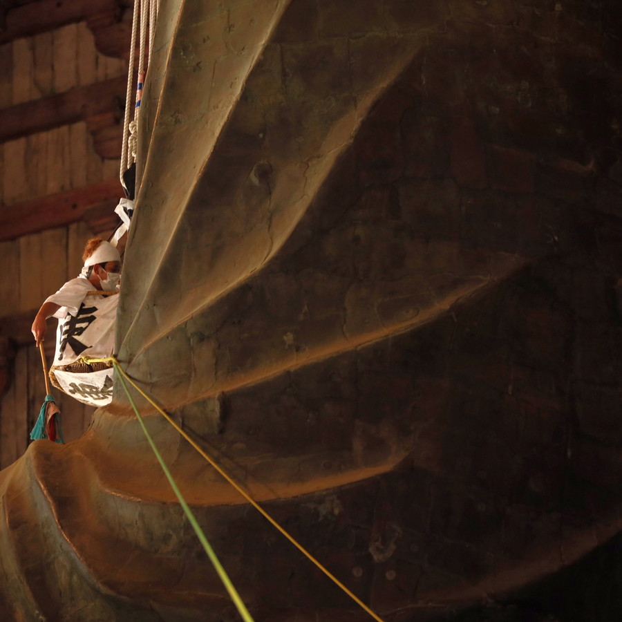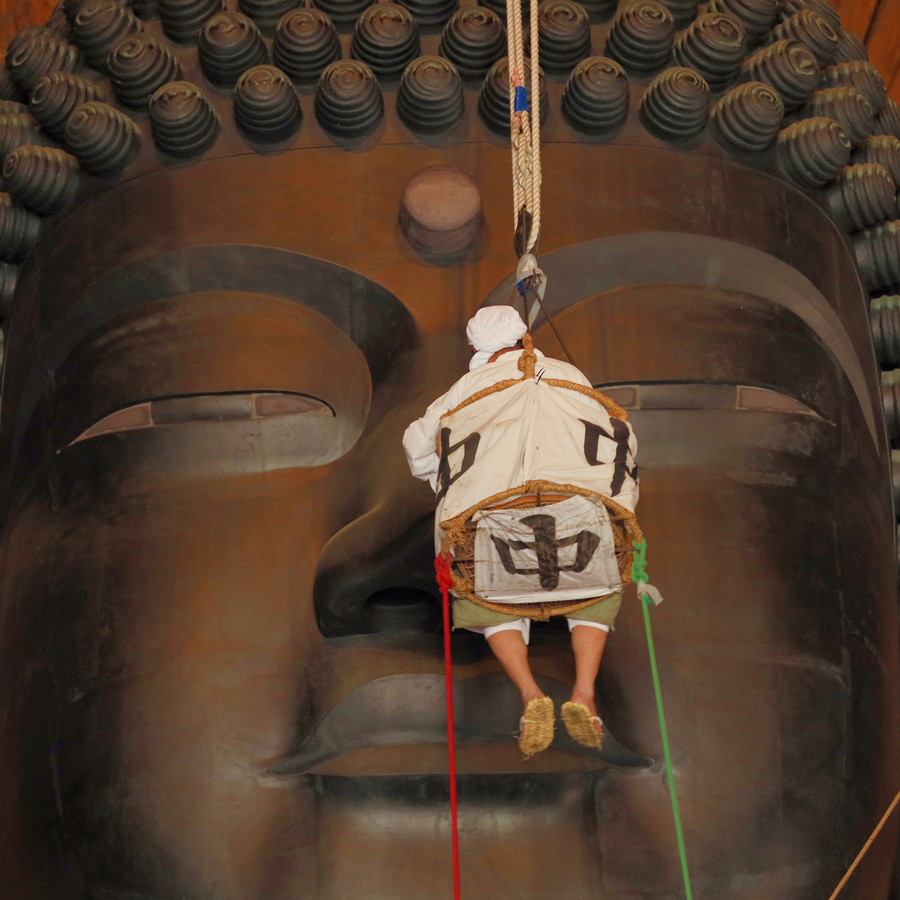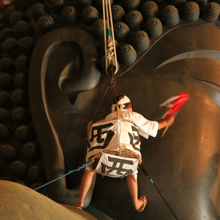 毎年8月7日に東大寺で行われてる大仏様お身拭いは白装束の僧侶がホコリを払い落してゆきます。顔など高いところは天井から吊した三つのかごにのって行います。