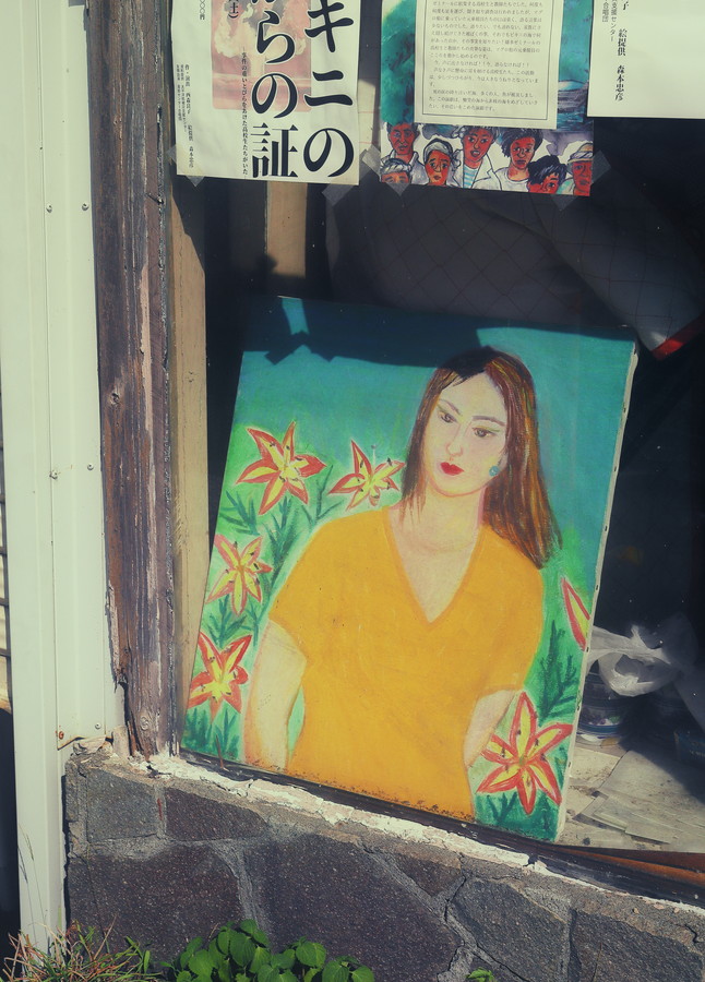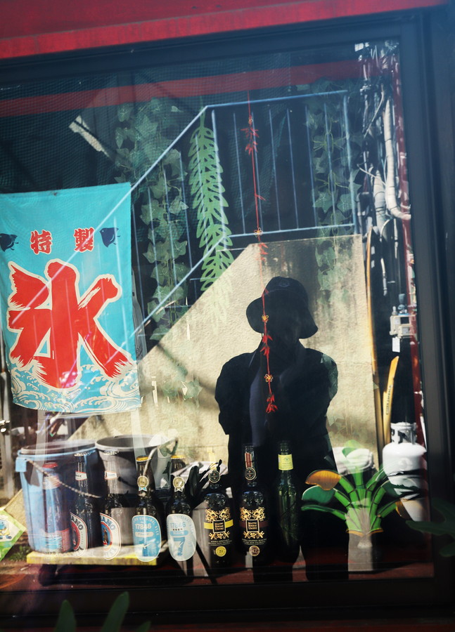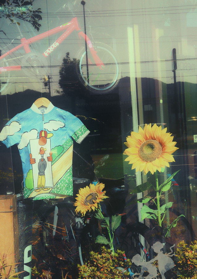 カメラ散歩も滞りぎみの暑さ、カメラ自転車に替えると、ちょっと涼しい。表通りの自転車屋のヒマワリが暑い。角を曲がるとウインドーの女性と目が合う。かき氷がひらっと揺れる夏…