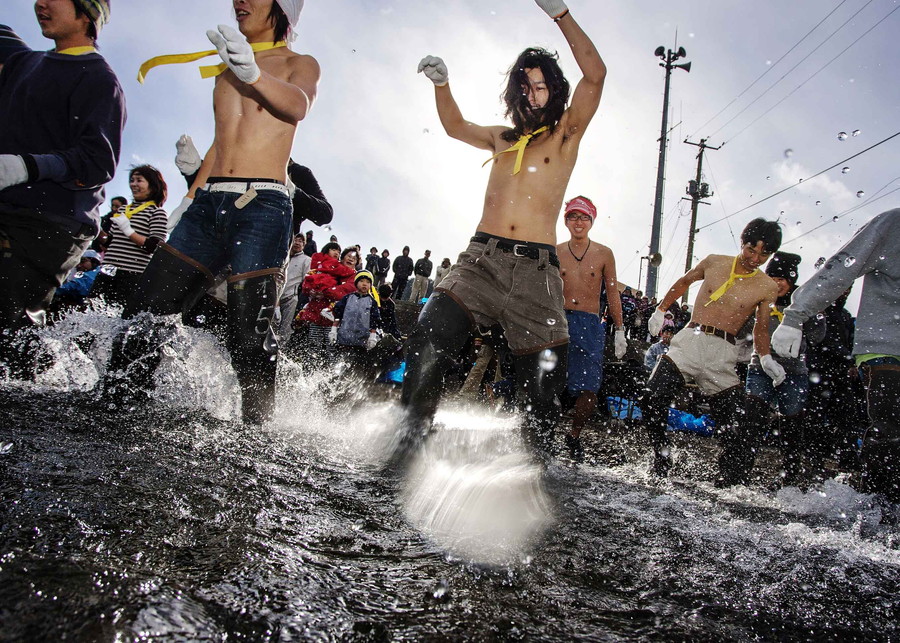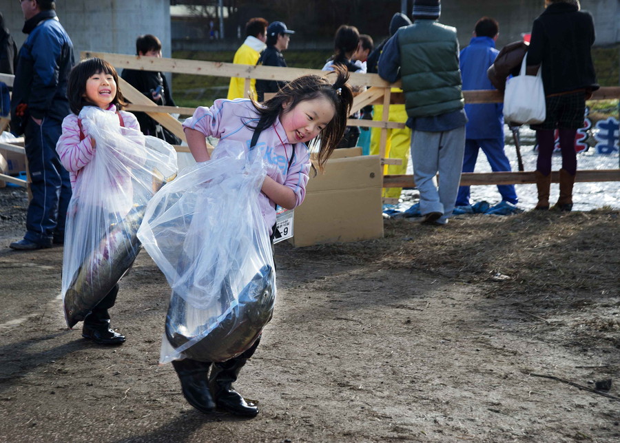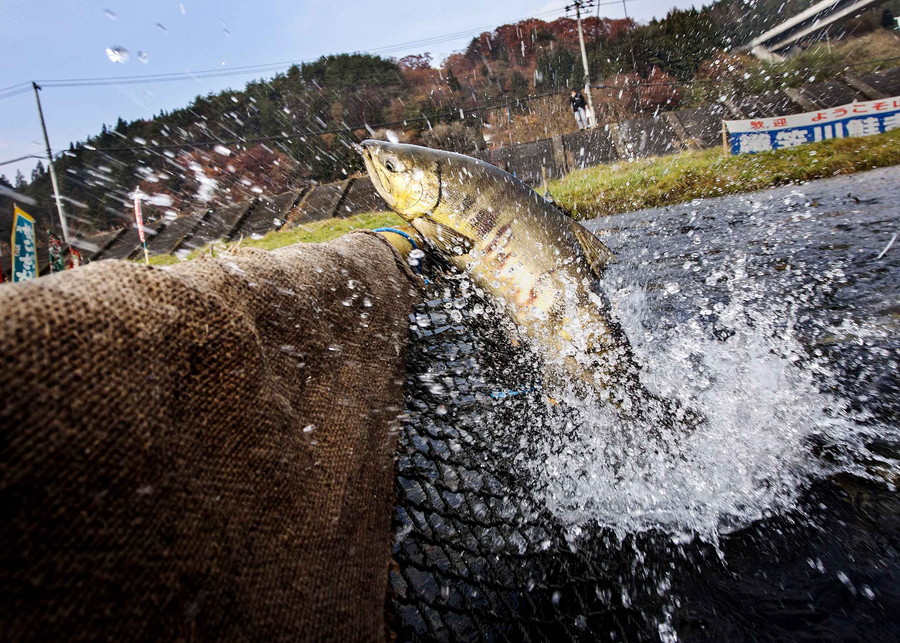 子供も大物をつかむために川を鮭をつかむため走るため寒い中転んで見ている人達を楽しませてくれます