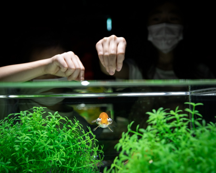 私もアートアクアリウム展に行ったことがあります。水族館と違って照明等が凝っていて芸術感がありますよね。一枚目の写真は、魚を見ている子どもたちを水槽越しに撮った写真。皆さん、マスクをしていますね。撮影年が2022年と記していますのでまだコロナ禍ですね。全体が赤紫色に輝いて綺麗です。二枚目の写真は、出目金ですか?水槽の上の手を見ている姿が愛らしいです。緑色の水草に赤色の金魚が目立って綺麗です。構図がいいですね。この写真が一番好きです。三枚目の写真は、水槽越しに金魚を見ている子ども。どこを見ているのかな?面白いです。3枚の写真の構成と構図が「こころつないで」のテーマに合っている面白い組写真作品です。