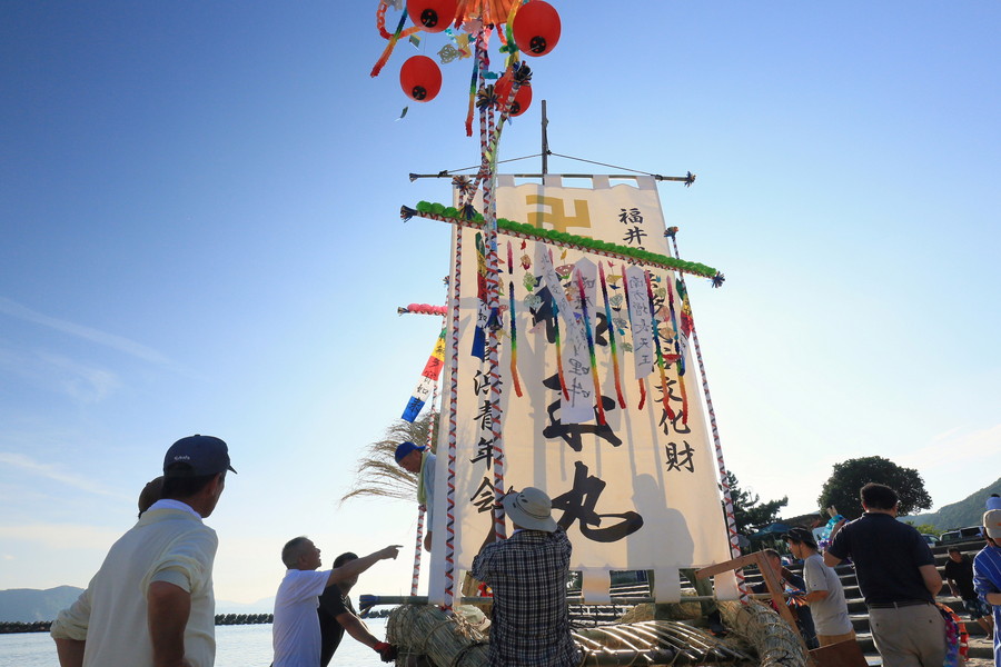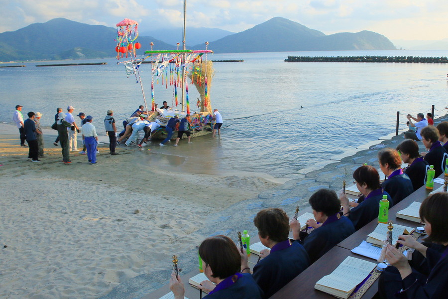 精霊船にはお盆に戻ってきた先祖の霊を再び海の彼方の浄土へと送り、浜辺では女性の念仏の声と波の音が聞こえ精霊船を見送ります