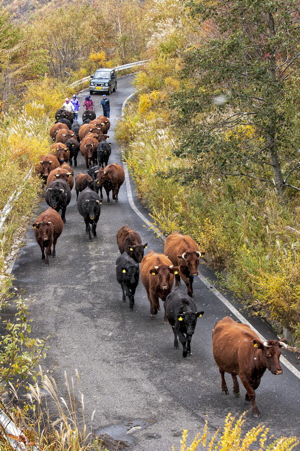 先導する人もいると思いますが、最後尾で一頭も外れることがないように見守りながら歩く人たち。無事に育った牛を眺めながら、安堵と家族はじめ一緒に働く人たちの苦労や笑顔も思い浮かべているでしょう。