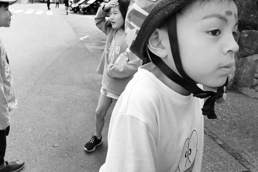 三重県松阪市飯南町粥見の粥見神社で20年に一度の正遷宮祭典が行われ、棟木札や弓、刀(神事用)などを持った神社役員と華やかな衣装に身を包んだ稚児行列が神社の周辺を練り歩き、遷宮を祝いました。この華やかな稚児行列の撮影じゃなくて終った後のお稚児さんの撮影。視点の付けどころが素晴らしいです。額に位星がまだ残っているのがお稚児さんと分かっていいですね。子どもたちの表情が「こころつないで」のテーマに合っています。構図が面白いし、露出もいい感じで稚児行列後の開放感を表現した素晴らしい作品です。
