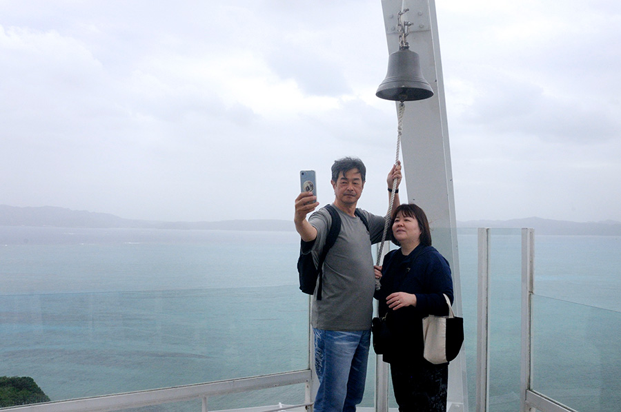 沖縄、古宇利島のオーシャンタワーです、展望台に鐘が吊るされており中年の仲睦ましいご夫婦が鐘を鳴らしていました。