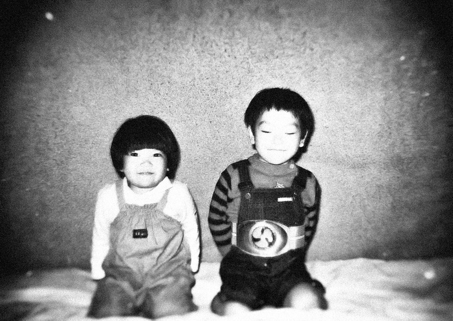 古い写真をスキャンしてデータ化、画像処理を加えて仕上げています。(モデルは息子と甥っ子)